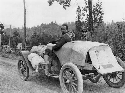 | Man, boy and dog head up the McKenzie River for camping trip in what appears to be a homemade motor vehicle comprised of sheets of metal fastened to chassis. Camping gear is strapped to running board where dog rides. Fence borders dirt road; forested ridge in background. c.1918 - Catalog Number: GN6764 |