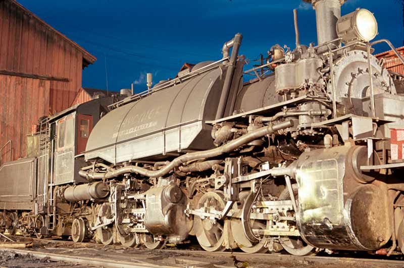 DH6967; 1965; Rayonier Incorporated steam locomotive engine #111 is illuminated in the late evening by Don Hunter's Steinheimer flash and "sun gun". Engine is sitting in the train yard of the old Rayonier railroad camp located six miles southeast of Humptulips, Washington.