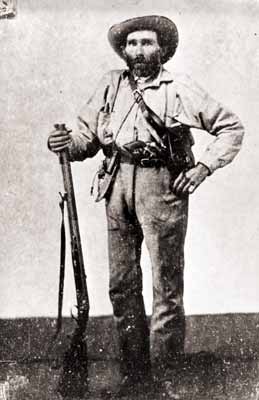 GN5110; 1848; Eugene F. Skinner, holding rifle and dressed in hunting gear. Said to be at Sutter's Fort in California preparing to return to Oregon after mining gold. Photograph of a portrait by R. Younger.