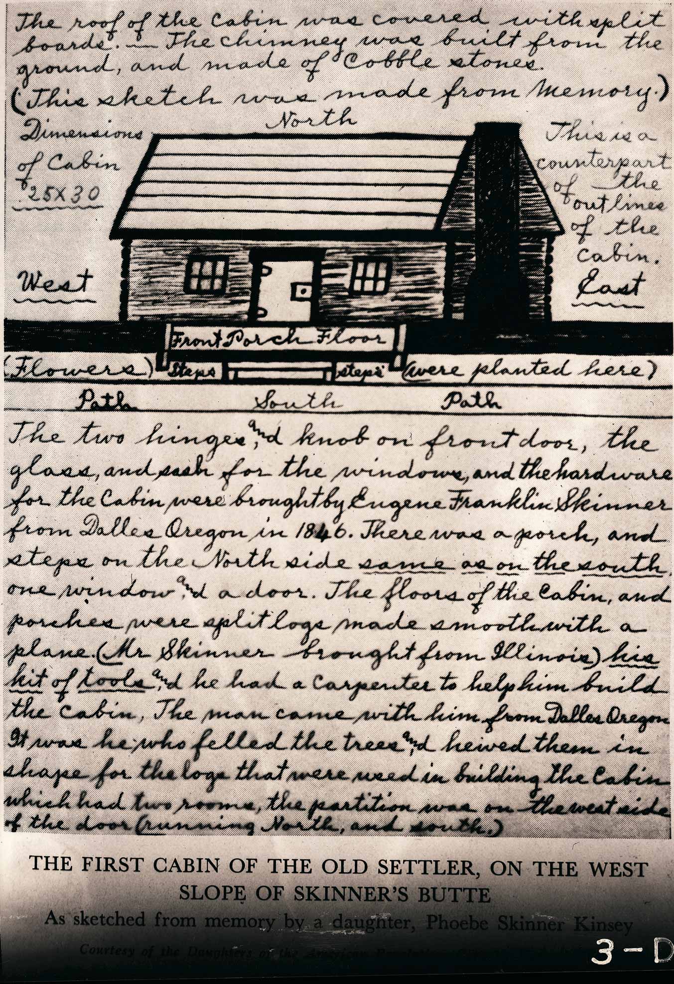 GN4955; c.1950; Sketch and description of cabin built in 1846 by Eugene Skinner, founder of the city of Eugene. Drafted from memory by Skinner's daughter, Phoebe Skinner Kinsey, c.1950.