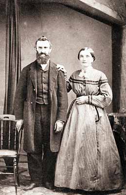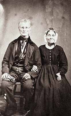 GN8521; n.d.; Elijah and Susannah Gabbart Bristow. Elijah Bristow, Lane County's 1st settler, founded Pleasant Hill in 1846. His family, including Susannah and most of their 15 children, came west to join him in 1848. Scene shows the couple seated side by side; Susannah has her arm through her husband's. She wears a ruffled cap with bow tied under her chin.