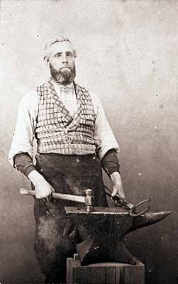 GN7755; 1863; Henry Bristow, member of the Bristow family which settled the Pleasant Hill area c.1846, poses with blacksmith's anvil, hammer and tongs. Bristow was born in 1824 and died in 1914.