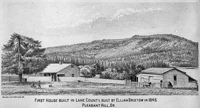 GN5942; 1884; The Elijah Bristow residence, Pleasant Hill, built 1846. Scene shows 1-story frame dwelling with attic and shingled sides at the left; barn and livestock on the right. Two boys and a dog play with wagon in foreground; tree-lined hills in background. The Bristow dwelling was the 1st house built in Lane County. Photograph of a lithograph.
