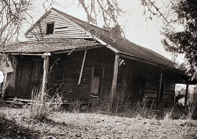 GN4943; 1903; The Elijah Bristow residence, Pleasant Hill, the 1st settler's home built in Lane County (1846). Exterior. View of weathered cabin with log walls and porches on both front and side of building.