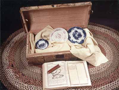 GN10128; 1976; Trunk in which one woman successfully transported china wrapped in blankets out west. Image shows a trunk holding china positioned on draped blankets, with a family Bible and spectacles positioned in the foreground. Items are arranged on a braided rag rug, and were brought to Lane County over the Oregon Trail, by Susannah Bristow in 1848.