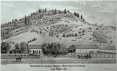 GN6211; 1884; Residence of Jacob C. Spores, 2 miles south of Coburg near the McKenzie River. Scene shows 1-story frame dwelling and barn surrounded by rail fences and young trees. Horse traffic and pedestrians pass in foreground; tree-lined hillside in background. Spores settled in Coburg in 1847 with his family and operated a ferry on the McKenzie River for many years. Ferry crossing was near site of present-day Interstate 5 freeway bridges. Photograph of a lithograph.