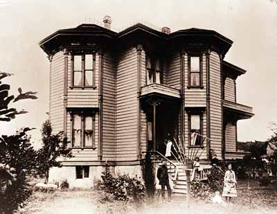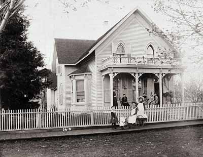GN447; c. 1888; F.M. Wilkins house, on northeast corner of West 9th Avenue and Charnelton. Exterior. Francis M. Wilkins standing to the left of stairs. Maude Wilkins standing to right with Lucia sitting at her feet. Mrs. Wilkins standing on porch. Frank standing on stairs and Nina sitting on railing. Tree nearest residence on left is a grand chestnut. California redwood barely visible at right.