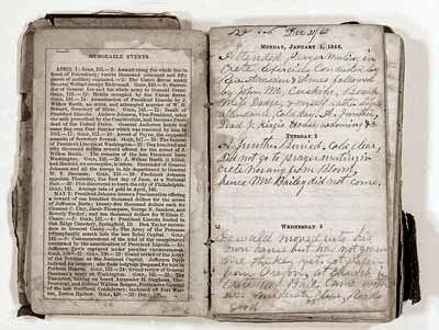 GN7510; n.d.; Diary pages from journal of Oregon pioneer Stewart B. Eakin, dated Monday, January 1st, 1866. Eakin and T.G. Hendricks co-founded the Hendricks & Eakins Bank in Eugene in December 1883.