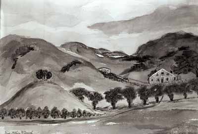 GN4841; n.d.; Donation land claim home of Mitchell and Permelia Wilkins, pioneers of 1848. Scene shows 2-story dwelling, barn and rail fence in hollow beneath grass-covered hills. Residence was north of Coburg and Willamette Forks. Centennial Butte is at left, with 3 trees planted on top. Photograph of a painting by the Wilkins' granddaughter, Nina Wilkins McCornack.