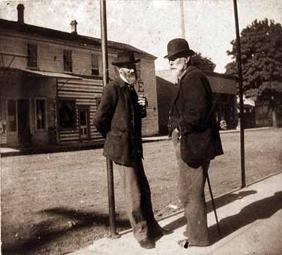 GN96; n.d.; John Whiteaker of Eugene in conversation with Charlie Davis. Whiteaker is on the right, wearing bowler hat and carrying cane. He was Oregon's first governor, serving from 1858 to 1862. Unpaved street and buildings in background; location unknown.