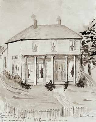 GN4846; n.d.; Residence of former Governor John Whiteaker, 974 Charnelton Street. Exterior. View of 2-story frame dwelling with pillared veranda; picket fence in foreground. Photograph of a painting, drawn from memory by Lucia Wilkins Moore.