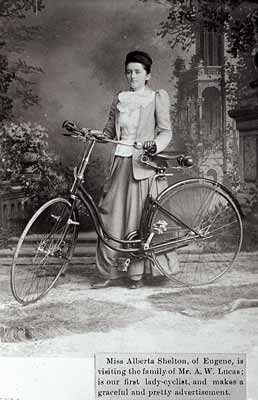 GN6824; c. 1895; Alberta Shelton (later McMurphey) poses with bicycle in photographer's studio. Newspaper clipping attached to base of photo announces her as being Eugene's "first lady-cyclist". Shelton was the daughter of Dr. Thomas W. Shelton who built the Shelton-McMurphey house at the north end of Willamette Street on the slopes of Skinner Butte.