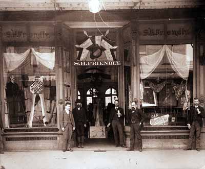GN944; 1893; S.H. Friendly Store, 594 Willamette Street (pre-1914 street number). Store was located on the west side of Willamette Street between 7th and 8th Avenues. Exterior. View from street. Museum file identifies men posed in entryway as Jesse Cohen, unknown, T.J. Nicklin, S.H. Friendly and A.T. Cockerline. Store sold dry goods.
