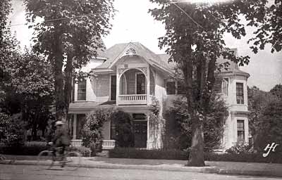 GN1121; 1909; Samson H. Friendly residence, 1015 Willamette Street (post-1913 street number). Exterior. View from street showing porch, balcony and bay windows. Man on bicycle riding past house.