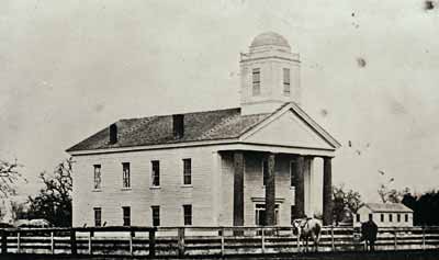 GN1409; c. 1870; Lane County Courthouse, built 1855, on the northeast corner of 8th Avenue and Oak Street. Exterior. View shows south and west sides of building surrounded by a rail fence with horses tethered in front.