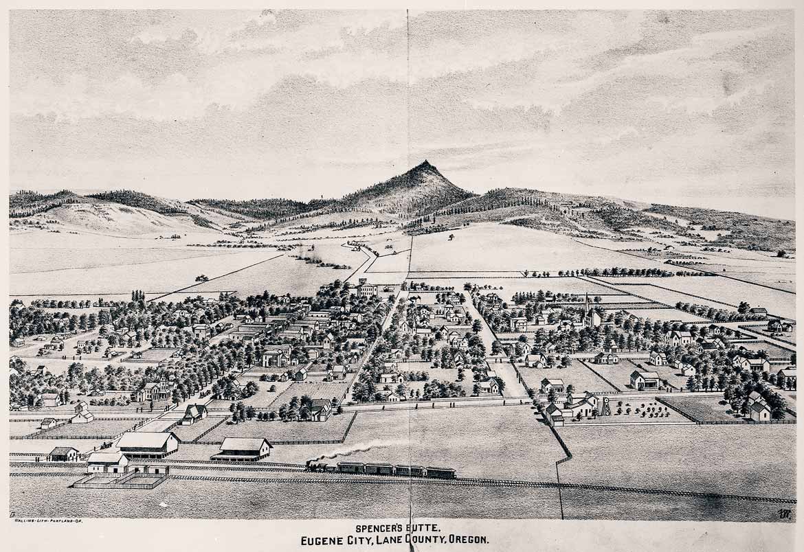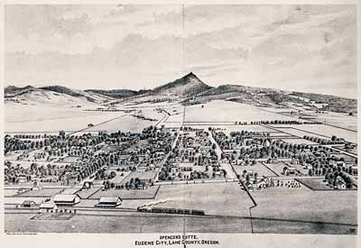 GN173; 1883; Photographic reproduction of a lithograph of Eugene, looking south toward Spencer Butte. Copied from Walling's History of Lane County (1884).