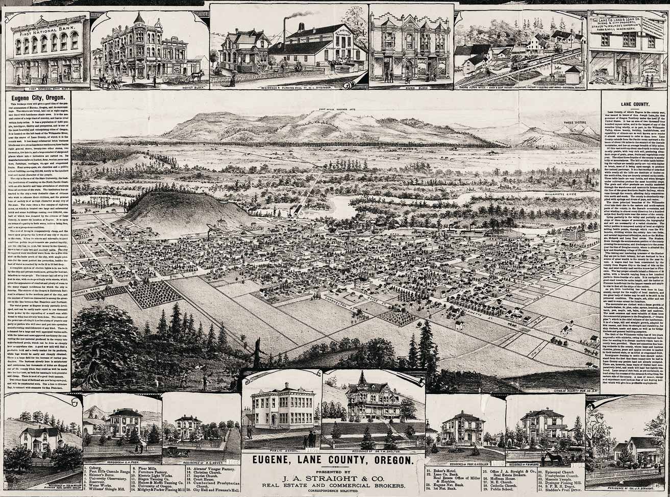 GN167; c. 1890; Photographic reproduction of a lithograph showing bird's eye view of Eugene, looking northeast. Surrounding the main image are small views of homes and businesses in Eugene; also text describing Eugene City and Lane County.