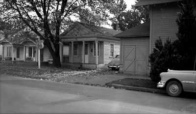 GN1677; c. 1950; Lane County Clerk's Office, 232 East 7th Avenue. Used as a rental at the time of this photo. Exterior. View from street showing small, one-story frame building with pillared porch. Building is now located behind the Lane County Historical Museum, 740 West 13th Avenue.