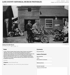 Several collections have been digitized through the Digital Scanning Project at Lane County Historical Society and Museum and are available online. The collections include photographs of Lane County from as early as the 1860s. Subjects include: historic residences; logging operations; people; steam locomotives and trains; and urban centers and buildings. Collections include (with object-ID): the General Collection (GN), Kennell Ellis (KE), Smith Mountjoy (SM); J.M. Nighswander (JN); Elizabeth Romane (ER and L82-516-), Henry R. Ross (HR), Chester Stevenson (CS) and John and Clarence Winter (WR).
