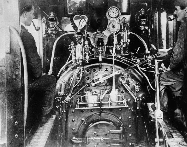Interior of the cab of Oregon and California Railroad's steam locomotive #1361. Two pipe-smoking engineers sit on either side of center control panel. Scene shows various dials and gauges, oil cans, oil lanterns and a heart-shaped mirror in an ornamental wooden frame. Date unknown – Catalog Number: GN4142