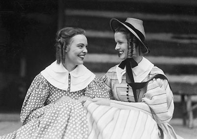 | Leading lady Mary Howard (left) sits next to an unidentified female, possibly Howard's stand-in, on location of the Academy Award nominated film "Abe Lincoln in Illinois". Howard played the role of Ann Rutledge, the supposed first love of Abraham Lincoln. c.1939 - Catalog Number: L82-516-16153 |