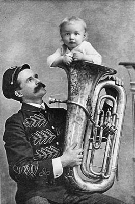 | Leroy Wood in band uniform holds a baby in the bell of his tuba. Wood probably lived in the Cottage Grove area. Date unknown – Catalog Number: GN4031