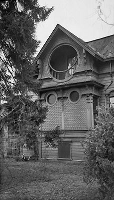 | Residence at 165 West 5th Avenue, formerly the Charles F. Littlefield home. Exterior. View from side yard showing gable balcony with circular opening and circular windows below. Date unknown – Catalog Number: GN1262 |