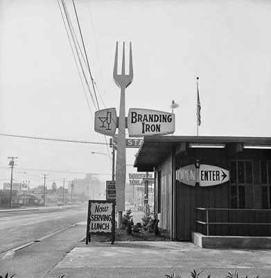 | Branding Iron Restaurant, 570 East Broadway. Exterior. View looking west toward Eugene Hotel in distance. c.1967 - Catalog Number: GN363