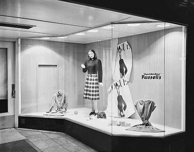 | Russell's Department Store, 64-66 East Broadway. Women's dresses in window display. Sign on window reads: "Eugene's Own Store/Russell's". 6 August 1945 - Catalog Number: GN389 |