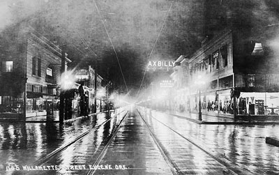 | Looking north on Willamette Street from 10th Avenue intersection, on a rainy night. Ax Billy Department Store, on the northeast corner of Willamette and 10th Avenue, appears on the right in the photo. Roach Music House, 986 Willamette Street, appears on the left. Street scene. c.1915 - Catalog Number: GN1047 |