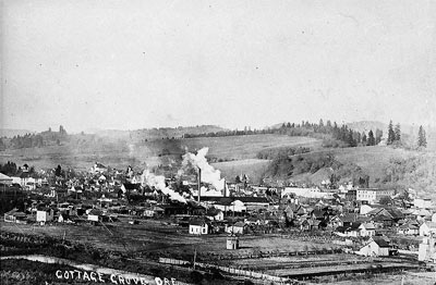 | Overview of Cottage Grove from unidentified location. School buildings with belfrys can be seen on the left; smoke rises from mills in center. c.1915 - Catalog Number: GN4021 |