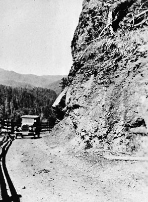 | Early automobile on the Central Military Road near Oakridge. Scene shows vehicle rounding curve in highway with a guardrail on one side and steep bluff on the other. Forest mountains in background. c.1917 - Catalog Number: GN4582 |