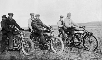| Six men ride double on 3 motorcycles in unidentified setting; open plains in background. c.1910 - Catalog Number: GN4477