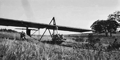 | Western Oregon Glider Club airfield near Springfield. Man in white shirt and tie is seated on glider and holding control stick prior to liftoff. Tow ropes are visible on right; man on grass in background holds glider's tail. c.1931 - Catalog Number: GN4654 |