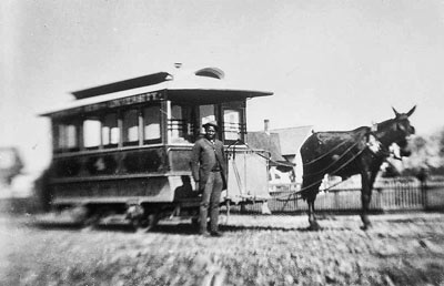 | Wiley Griffon (sometimes spelled "Griffin") poses with the mule-drawn streetcar that he drove from Willamette Street to the University of Oregon. The mule-driven line was owned by Henry W. Holden, and was later replaced by Portland, Eugene & Eastern Company's electric line. Wiley Griffin was one of Eugene's first black residents. c.1893 – Catalog Number: GN4127