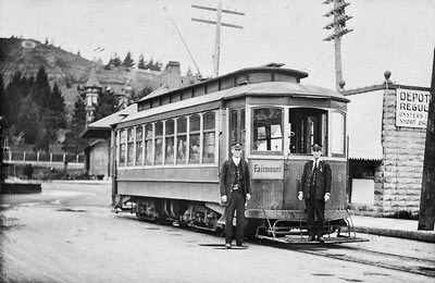 | Portland, Eugene and Eastern streetcar for the Fairmount Street run, parked at the beginning of the line near the Southern Pacific Railroad Depot on the north end of Willamette Street. Two crewmembers pose in foreground; towers of Shelton-McMurphey residence and Skinner Butte can be seen in background. c.1909 – Catalog Number: GN4126 |