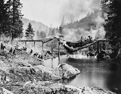 | Train wreck scene from the Buster Keaton movie, "The General", filmed on the Row River near Cottage Grove in the summer of 1926. Image shows steam locomotive and coal car on bridge, collapsing into river below. Men on horseback watch from riverbank on the left. c.1926 – Catalog Number: GN4206 |