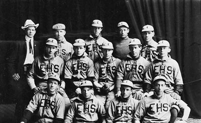 | Eugene High School baseball team members pose in their uniforms. Team coach, in suit, appears at far left. Exact year unknown. c. 1910 – Catalog Number: 4625 |