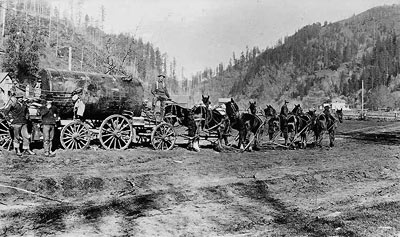 | Eight-horse team and crew haul boiler to the coast on Tilden Rock Road. Boiler became first steam "donkey" engine to operate on this portion of the coast. Scene shows dwelling in the distance in forest-lined valley. c.1915 – Catalog Number: GN4085