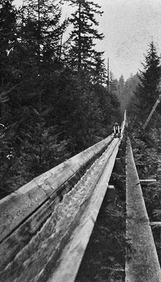 | Worker rides flume between Prune Hill and Saginaw, 2 miles north of Cottage Grove. Scene shows flume trough, used to transport lumber via water and gravity, running through treetops. c.1912 - Catalog Number: GN3931