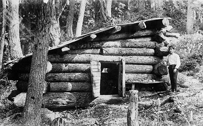 | Residence of photographers George Worth and Clarence Noe, while they visited the Bohemia mining district southeast of Cottage Grove. Worth stands to the right of small log building with sloping roof and half-size entry doorway. Date unknown – Catalog Number: GN3848 |