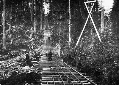 | Surface tramway at Champion Mine mill, in the Bohemia mining district southeast of Cottage Grove. Scene shows miners riding ore carts on double-track tramway down forest-lined incline. Tramway was later covered over. c.1908 - Catalog Number: GN3781 |