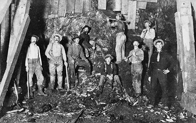 | Crew at North Fork tunnel near Westfir and Oakridge pauses for photo. Men are carving tunnel wall with picks and are wearing grimy overalls. Boards and beams support tunnel walls and ceiling. Tunnel was part of Southern Pacific Company's Natron Cut-off, the railroad route from Eugene to Klamath Falls. c.1912 – Catalog Number: GN4294